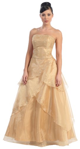 | 5 of 5 people found the following review helpful: By Amazon Verified Purchase This review is from: Ball Gown Elegant Formal Prom Wedding Dress #2460 (Apparel) I purchased this dress in Ivory to wear as my wedding dress. I am top heavy (bra size 40I) and it was very hard to find a regular wedding dress to fit up top, especially within my small budget. I purchased the dress in a size 20 and have plenty of room for my bust area. The dress came with a shoulder wrap and detachable straps. The straps are pretty much useless though. They're thin and the attaching hook is visible when they're on. If you want straps for this, and don't care about the wrap, I would suggest using the material from the wrap to make straps. The styling is just like the picture. It's very pretty and has a unique layered look. The skirt is sufficiently full on its own, but I added a petticoat to really make it pop. The embroidery and beading look okay. It won't impress anyone, but they do add to the beauty of the dress. You will probably have to reinforce some of the threads holding on the beadwork. They're not individually sewn on... Read more |
