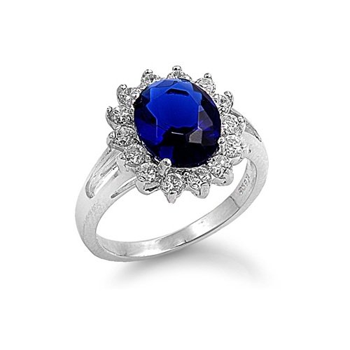Made of .925 Sterling Silver and featuring a 10 ctw Blue Sapphire CZ (10mm x 8mm) surrounded by 0.02 ctw (2mm) clear diamond simulated CZs. The world knows this this stunning blue sapphire royal engagement ring and, like any classic, the world takes note when you wear this gem.