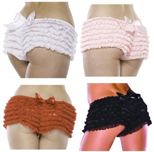 | 2 of 2 people found the following review helpful: Amazon Verified Purchase This review is from: Coquette Ruffle Shorts with Back Blow, One Size (Apparel) Very cute and COMFORTABLE! I'm size Large and decided it was better to be safe and buy the bigger, just in case.. I can sew and adjust if needed.. welp, they fit perfectly. My Husband saw me dawning them and said "NICE! I like those! I APPROVE" and proceeded to undress me with his eyes. Back to buy a few more pair :D 2 of 2 people found the following review helpful: By Amazon Verified Purchase This review is from: Coquette Ruffle Shorts with Back Blow, One Size (Apparel) I bought these for a pinup photo shoot and they are very cute. They fit pretty well, except for being a little short in the front. What I mean is, they don't quite cover the belly, which is important when you're plus-size! I don't think that if I had bought a bigger size, they would have fit better. I think it's just the way the panty is cut. Other than that, these are really cute. 4 of 5 people found the following review helpful: By Polyfamily4love (Edinboro, PA USA) - See all my reviews This review is from: Coquette Ruffle Shorts with Back Blow, One Size (Apparel) I have been looking for ruffle panties for my Princess forever. She has 44' hips so it is not so easy to find good quality dress up clothes. Not only did these fit great, the look and feel of these are far beyond excellent. Thick and frilly well made and worth every penny. If you love the curves and ruffles these are the ones to get. |
