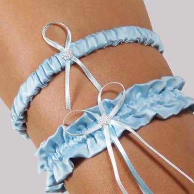 Gorgeous blue satin is adorned with a cluster of white glass pearls on a white satin bow. Includes a free tossing garter. This garter offers an adjustable fit from sizes XS to XL.