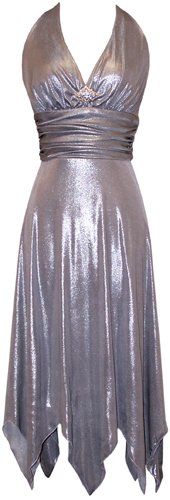 Sexy stretch metallic jersey halter dress with rhinestone pin, matching scarf, fully lined, back zip. Great for prom, bridesmaid, homecoming, cocktail dress, evening gown or formal. Junior size XS-3X.