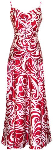 Striking satin bias-cut gown, fully lined, halter tie & zip back, white chiffon scarf. Junior sizes XS-3X.