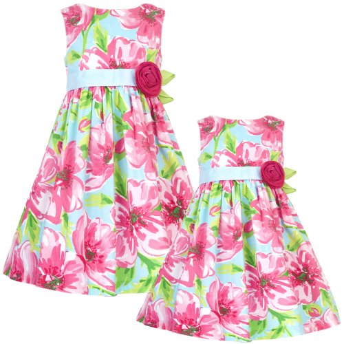 Beautiful FUCHSIA-PINK BOLD FLORAL PRINT DRESS features sleeveless bodice with round neckline and BLUE GROSGRAIN RIBBON & RAW-EDGE ROLLED ROSETTE ACCENT at the waist. Fully lined, knee-length AQUA-BLUE WOVEN SKIRT features BOLD PINK & GREEN FLORAL PRINT and attached slip with ruffled crinoline underskirt for added fullness plus back zip closure and AQUA-BLUE GROSGRAIN RIBBON BOW TIE SASH IN BACK for perfect fit. Hand wash, line dry. Imported (Sri Lanka). Of cotton/spandex - Lining of polyester/cotton - Crinoline of nylon - Exclusive of trim/decoration. Matching/Coordinating sister styles available in sizes 2T-16, search for style(s): RRE-53422. More baby & girl party dresses available, search for: "rre-girl-party-dress "