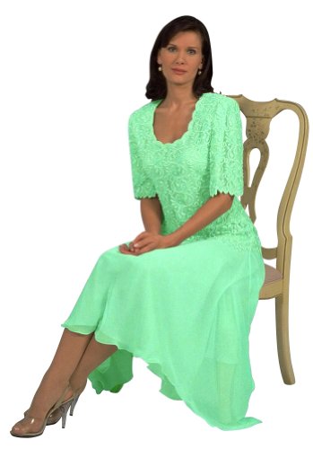 One of the best dresses you will ever put on. The full cut Tea Length chiffon one piece dress with pearled and beaded lace overlay is really great. The colors we are offering are a Soft Pink, Soft Mint, and Navy Blue. The Pink is a soft pink, the Mint is